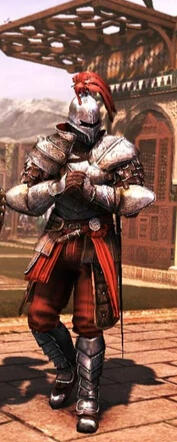 Medium to Long Length Blonde hair, messily tied back into a ponytail. Brown eyes. Wide, muscular body. Most often is clad in hard italian steel, decorated in red cloth, and fit with a large red plume atop his helmet. Wields a claymore exclusively.