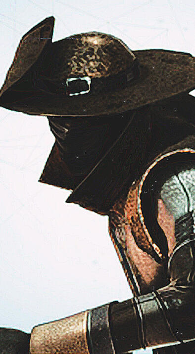 Carries a large hookblade, throwing knives and other single-use defenses. Dons a brown wide-rim hat with a single side stitched upward.