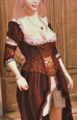 Long blonde hair, messily tied back into a long braid down to thighs. Brown eyes. Curvy body type. Most often dressed in an red, pink and white off the shoulder dress. Dons a lattice scuffia atop her head.