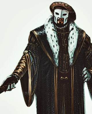 Appearance: Short Black hair, marred facial features/loss from his right eyebrow down to his left cheek. Bridge of the nose is broken inward, a bit ajar. Dons a white porcelain mask, ermine fur lining traditional northern Italy royal attire. Carries only a slender, single-action bolt gun, though he favors poison's uses.